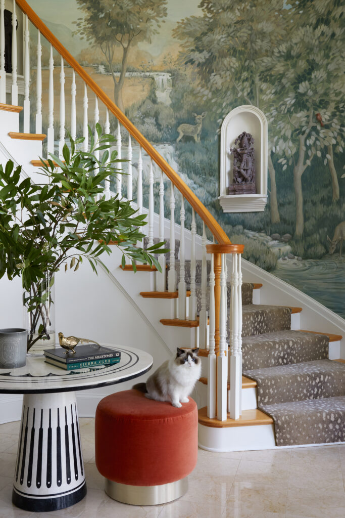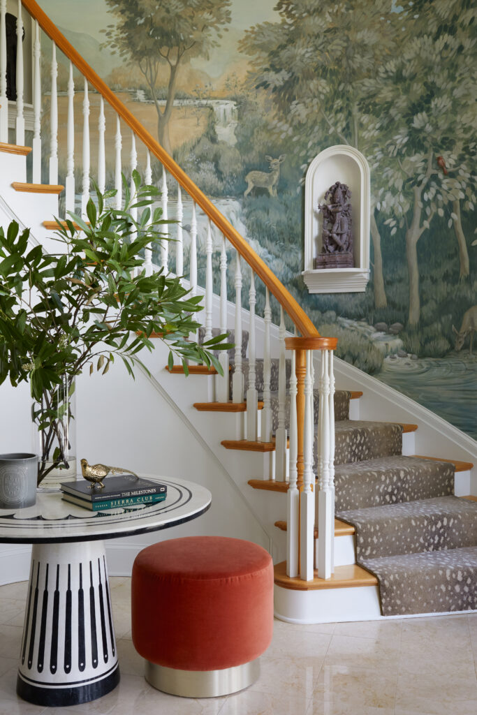From the moment guests enter the home, they’re met with a scene that sets the tone for everything that follows. In the foyer, a hand-painted landscape by Lenehan Studios stretches across the wall. A tranquil composition of water, trees, and wildlife. This mural was thoughtfully chosen to evoke happiness, warmth, and positive energy, creating an immediate feeling of welcome.