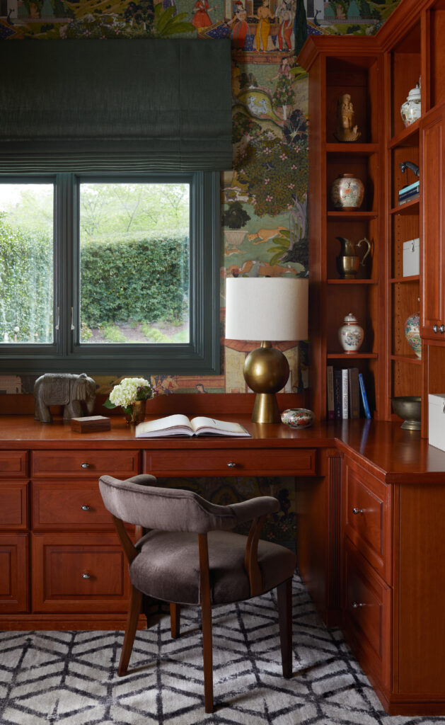 In the family’s office, we incorporated Mind The Gap’s Jaipur wallpaper, an exquisite pattern that instantly reminded the homeowners of their birthplace. Its rich, soothing tones envelop the room, grounding it in history while complementing the built-in cabinetry’s functionality.