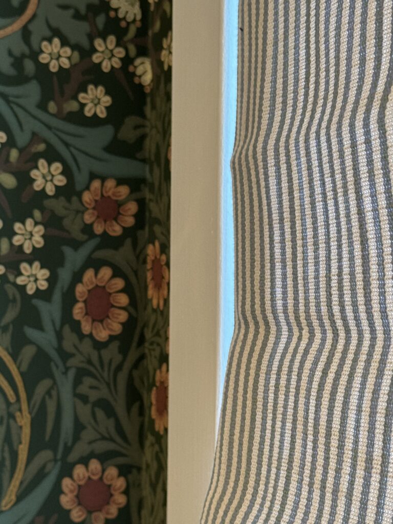 Framing the space, rich botanical-patterned wallpaper from Morris & Co. in deep green tones envelops the room in warmth, offering a subtle nod to nature. Crisp white wainscoting below grounds the bold pattern, adding contrast and brightness that keep the space feeling balanced and timeless.