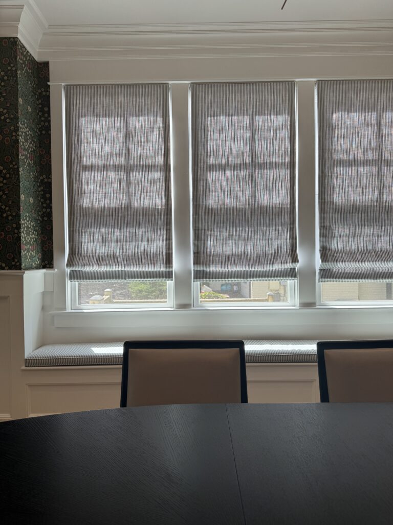 During the day, softly textured Roman shades filter natural light, filling the space with a warm, calming glow. As evening settles, the chandelier takes center stage, casting an intimate, elevated ambiance that shifts the room effortlessly from family dinners to elegant entertaining.
